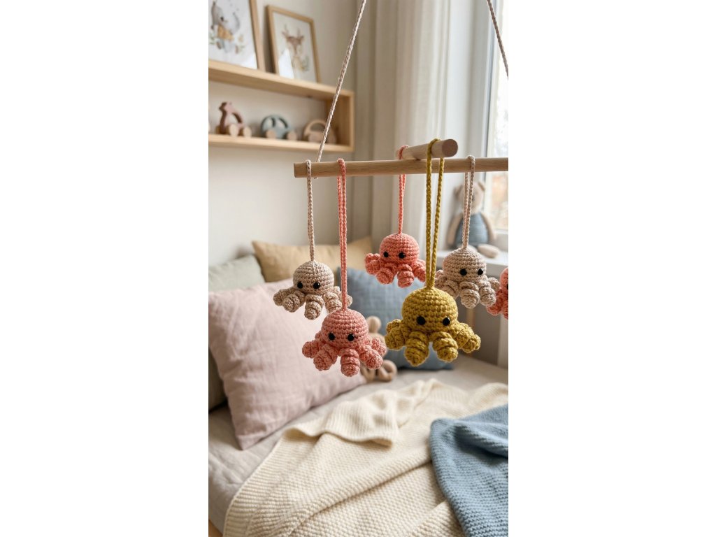Veselá háčkovaná chobotnička je originální doplněk, malý parťák do kapsy nebo přívěsek na zip baťohu, tašky, i kufr. Díky svému barevnému provedení se stane milým doplňkem dětského pokojíčku, postýlky nebo kočárku. Každý kus je pečlivě vyrobený a jedinečný.