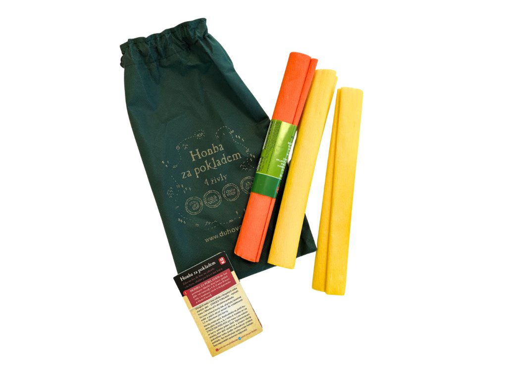 Součástí balení je pytlíček z netkané textilie se 16 laminovanými kartičkami se 64 zajímavými a vzdělávacími úkoly, krepový papír na fáborky (3 minirole vel. 25 x 200 cm - 2 pro trasu a 1 na označení úkolů), poklad není součástí - ten zajistí hráči sami.