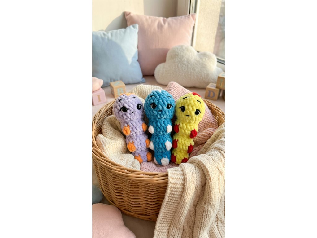 Tato měkkoučká háčkovaná housenka je dokonalým společníkem a milou dekorací, která i příjemně chrastí. Díky svému barevnému provedení se stane výrazným doplňkem dětského pokojíčku, postýlky nebo kočárku. Každý kus je pečlivě vyrobený a jedinečný, takže přinese radost.