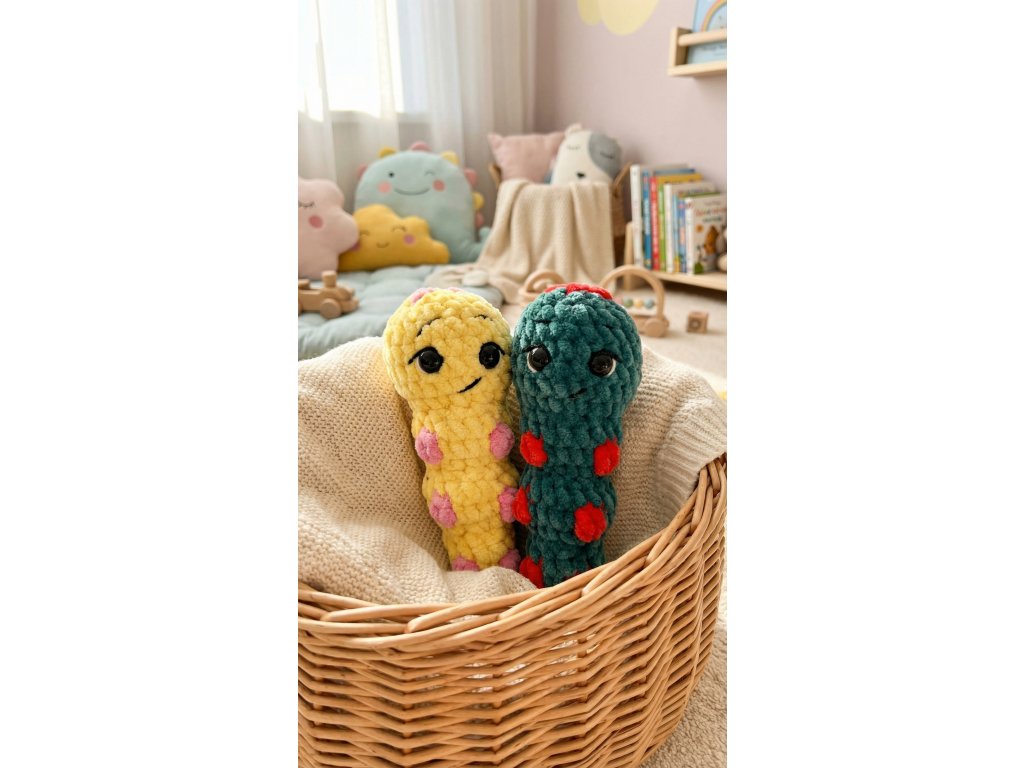 Tato měkkoučká háčkovaná housenka je dokonalým společníkem a milou dekorací. Díky svému barevnému provedení se stane výrazným doplňkem dětského pokojíčku, postýlky nebo kočárku. Každý kus je pečlivě vyrobený a jedinečný, takže přinese radost.