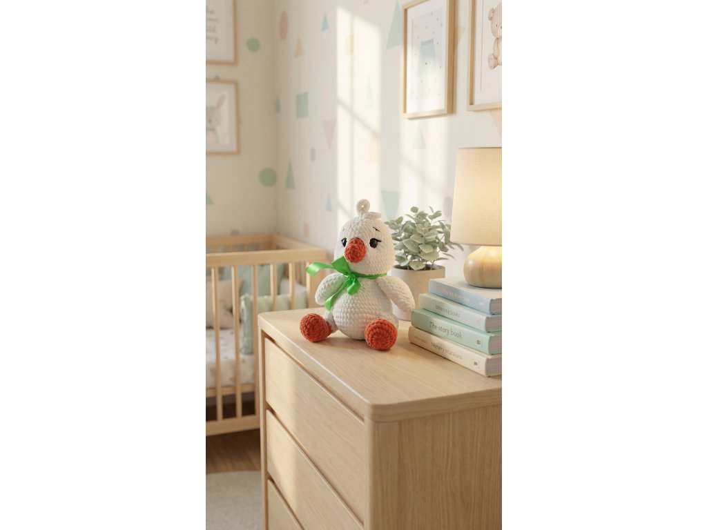 Háčkovaná bílá kačenka je jemná dekorace do dětského pokojíčku, která zútulní prostor u postýlky, na poličce nebo komodě. Svým kouzelným a rozkošným vzhledem působí mile a klidně, takže se skvěle hodí k dětskému prostředí a vytváří pocit bezpečí, něhy a radosti.