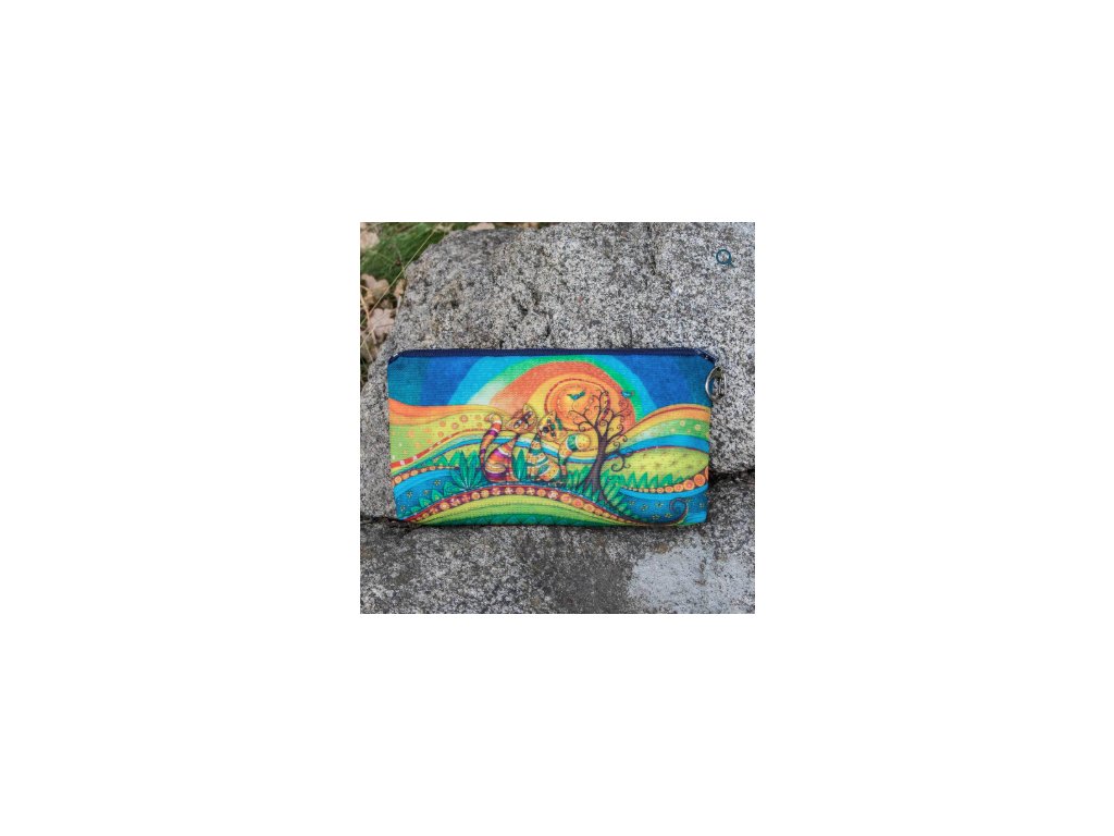 Kapsička s autorskou ilustrací obrázku, která je na obou stranách. Kapsička na brýle, toaletní potřeby nebo na různé poklady. Díky karabince se lehce otevírá a dá se připnout do kabelky. Dokonalá na prázdninové cesty, při kterých jsou malé kapsičky na kartáčky na zuby nebo pastelky vždy třeba. Obrázek je vytištěn na polyesterové plátno, uvnitř je vyložena polyesterovým mikroplyšem. Vnější materiál 100 % PES je pevný a trvanlivý. Potisk má vynikající stálobarevnost. Formát kapsičky 22 × 11 cm.