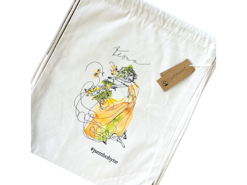 Bavlněný batůžek s BIO certifikací s potiskem březnové bohyně Vesny. Krásná ilustrace pochází od lotyšské výtvarnice Ievy Ozoly.