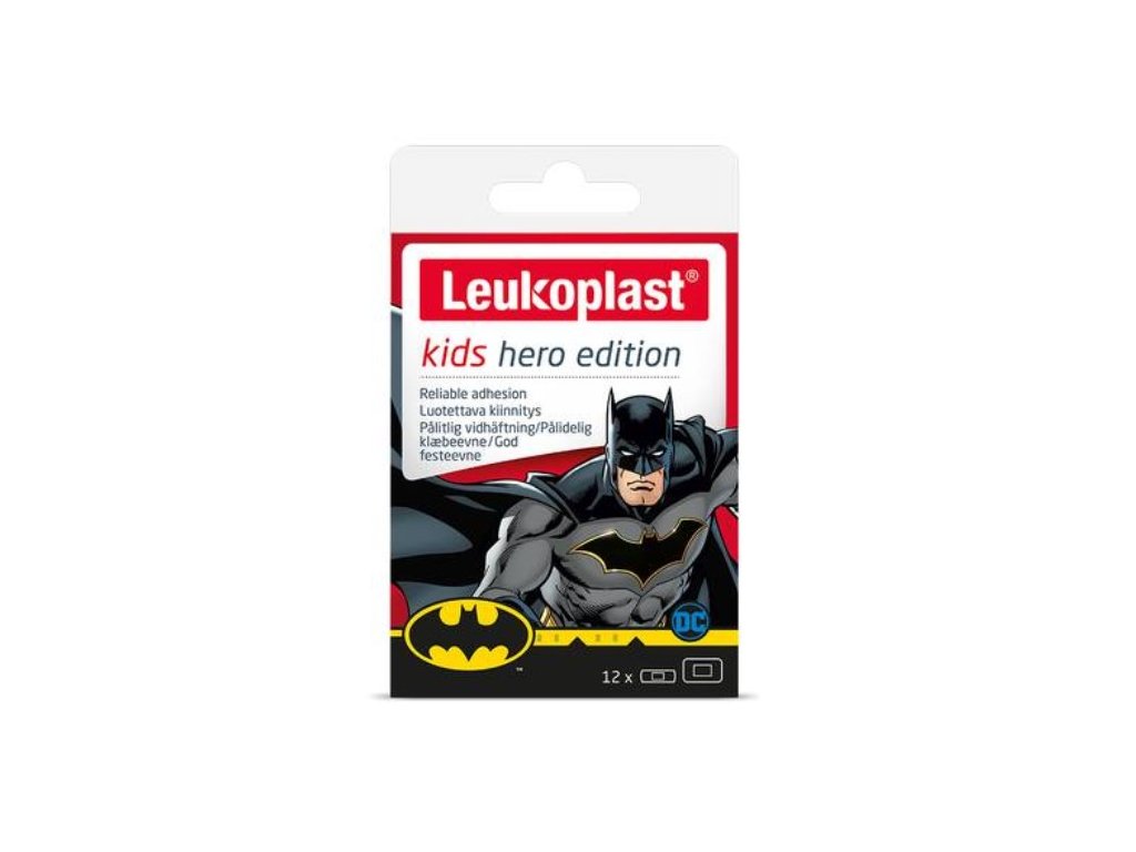 Leukoplast Kids Hero je náplast na rány s polštářkem pro děti. Náplast je voděodolná, se speciálním dětským designem s Batmanem. Leukoplast Kids Hero je vzhledem ke své elasticitě pohodlnou a okamžitou možností krytí na drobná i větší poranění.