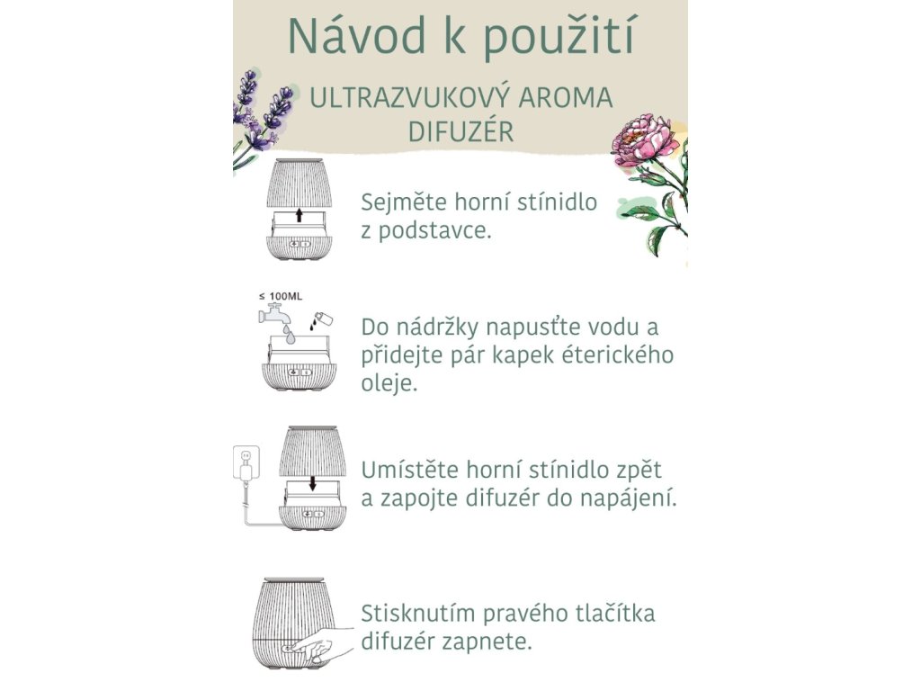 Přeneste vůně přírody do svého domova s ultrazvukovým aroma difuzérem, který jemnou mlhou šetrně rozptyluje éterické oleje bez přehřívání. Díky tichému chodu je ideální pro chvíle relaxace i klidný spánek. Difuzér nabízí LED podsvícení v 7 barvách, mezi kterými můžete snadno přepínat, a dva provozní režimy – nepřetržité nebo přerušované odpařování (15 s rozptyl, 15 s pauza). Je vhodný do místností o velikosti až 50 m². Ultrazvukový aroma difuzér rychle a bezpečně provoní domácnost, kancelář, recepci či čekárnu a vnese do každého prostoru příjemnou atmosféru pohody.